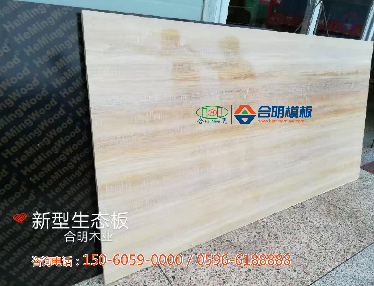 合明新型生態板上下表面覆有生態膜紙,表面光滑,防水耐腐蝕。
