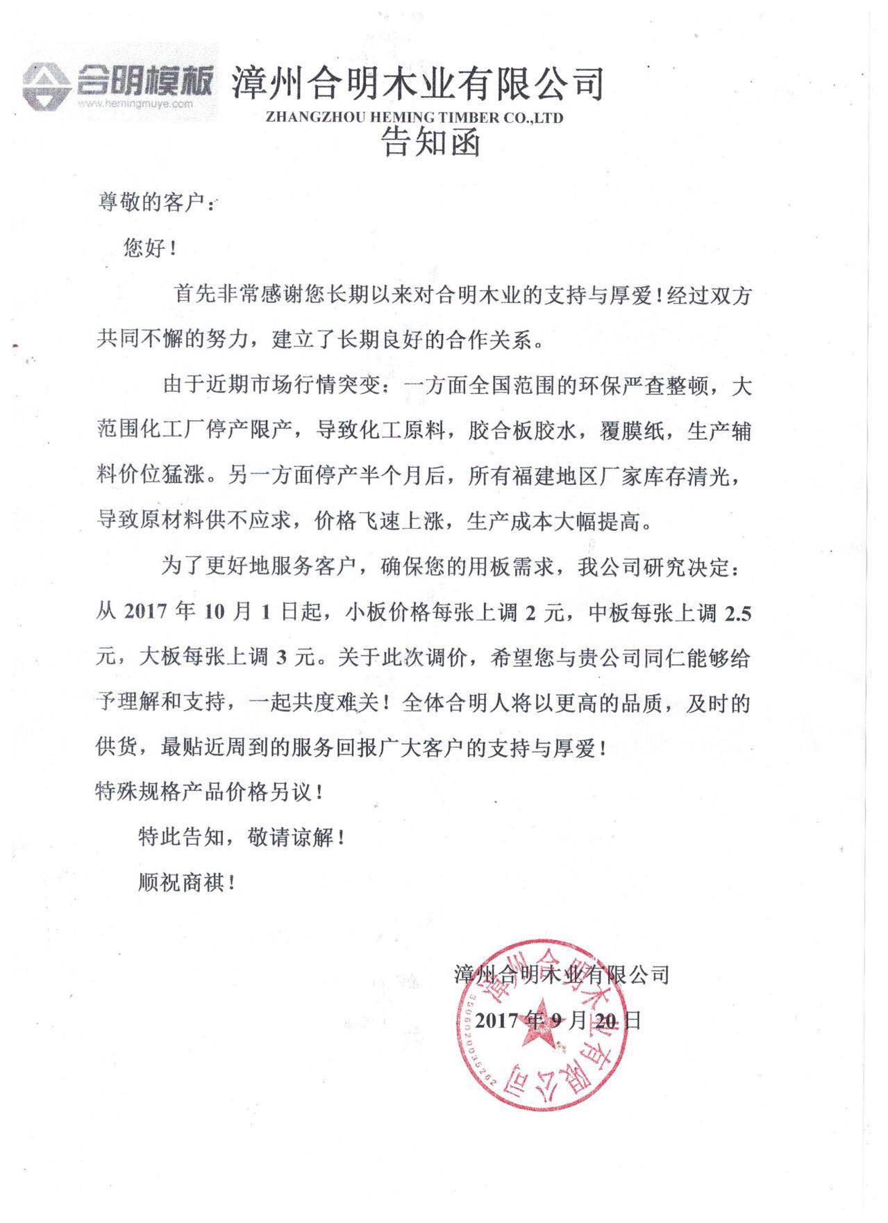 迫于上游原材料匱缺導致價格暴漲,導致合明模板原材料價格猛漲,公司不得已進行上調價格!10月1日起開始執行上調價格!請理解告知!