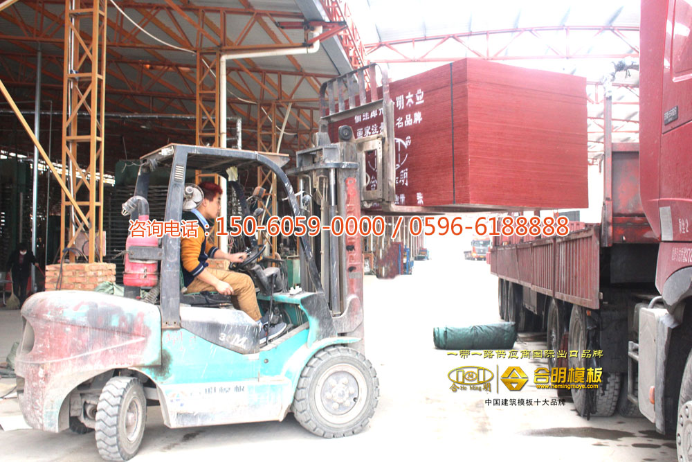 物流部早已準備好出貨單,跟倉庫進行對接,十幾輛鏟車有條不紊地把模板從倉庫運送至掛車上,掛車上的裝貨師傅跟鏟車司機默契合作,將合明模板整整齊齊地疊放在掛車上,蓋上塑料防水膜,牢牢地綁上繩子,確保運輸過程安全。