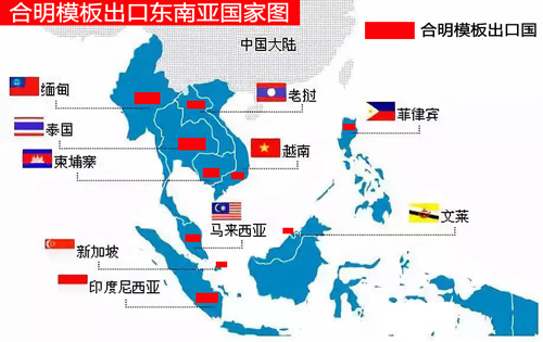 合明模板出口除了東帝汶外的全部東南亞國家,包括:越南、老撾、柬埔寨、泰國、緬甸、馬來西亞、新加坡、印度尼西亞、文萊、菲律賓等10個國家。
