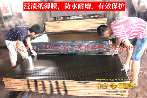 合明覆膜板表面覆有浸漬紙薄膜,這層浸漬紙薄膜經(jīng)超高溫超長時(shí)間壓制,膠水及薄膜滲透均勻,使建筑模板表面更平整光滑,更加耐磨防水,大大延長了模板的使用壽命。