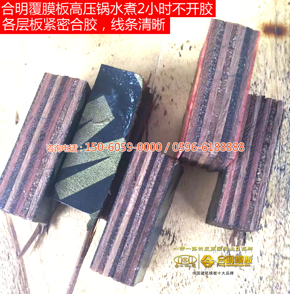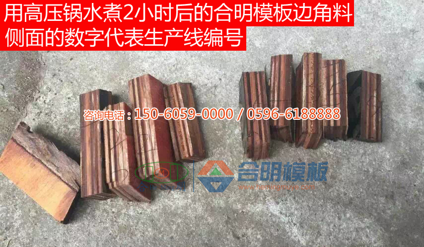 合明模板邊角料(合明模板樣板)在高壓鍋沸水煮2小時不開膠。一般在高壓鍋可以煮2小時不開膠的模板在工地使用中可周轉8次以上。