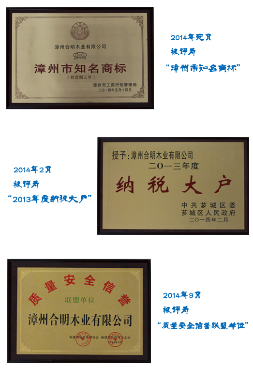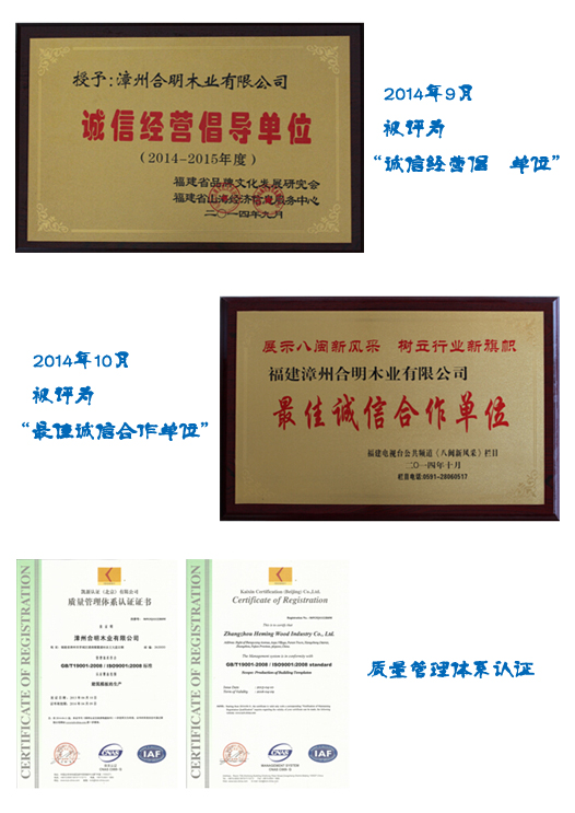合明木業(yè)憑借十幾年的發(fā)展位列“中國建筑模板十大品牌”,其自主品牌--合明牌建筑模板在業(yè)內(nèi)廣受好評(píng)。2014年,合明木業(yè)及合明牌建筑模板系列產(chǎn)品,以其高質(zhì)量的產(chǎn)品和高標(biāo)準(zhǔn)的企業(yè)精神,再次被社會(huì)各界給予高度評(píng)價(jià)。